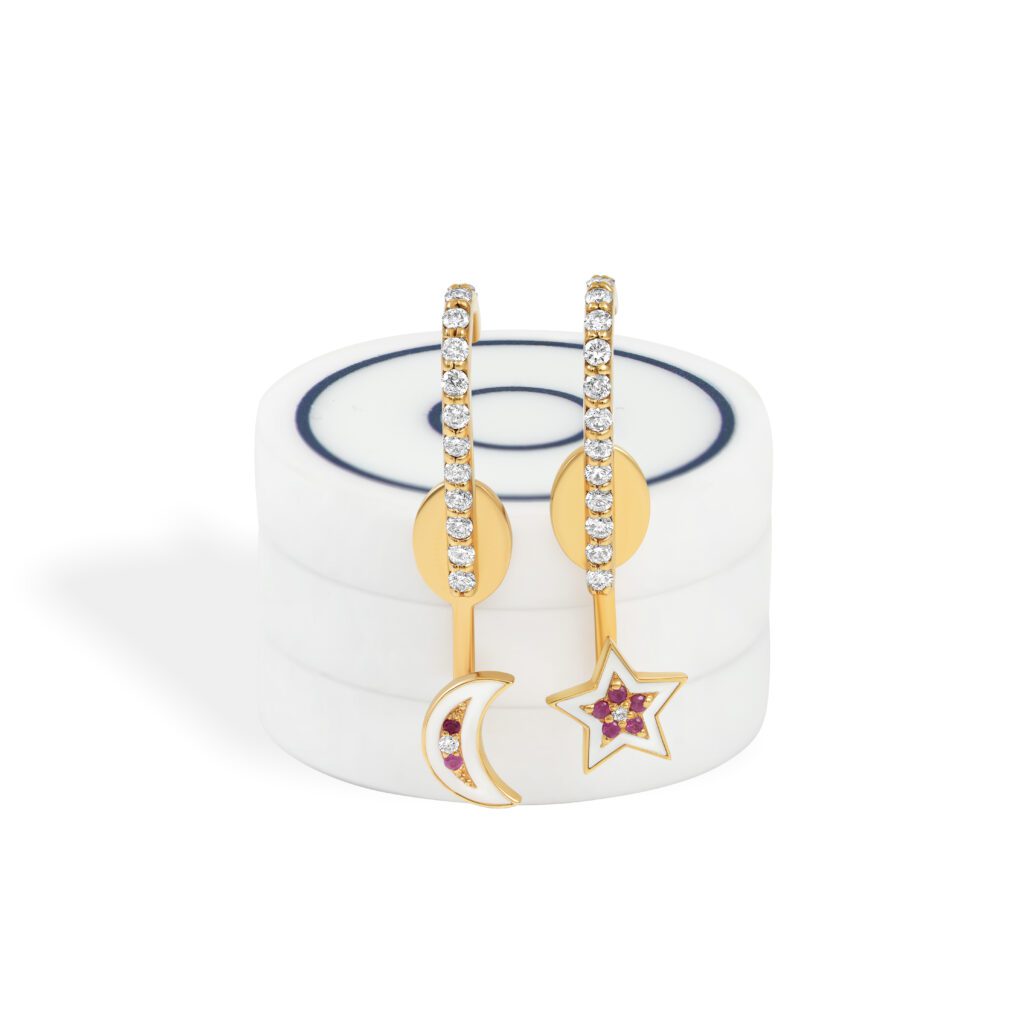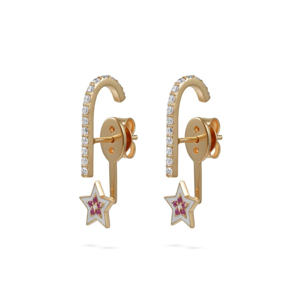 Crafted in 18k Rose gold, these pair of heart stud earrings features a delicate double-heart design. Embellished with red ruby, pink sapphire, and diamonds, they offer a soft pop of color and sparkle
