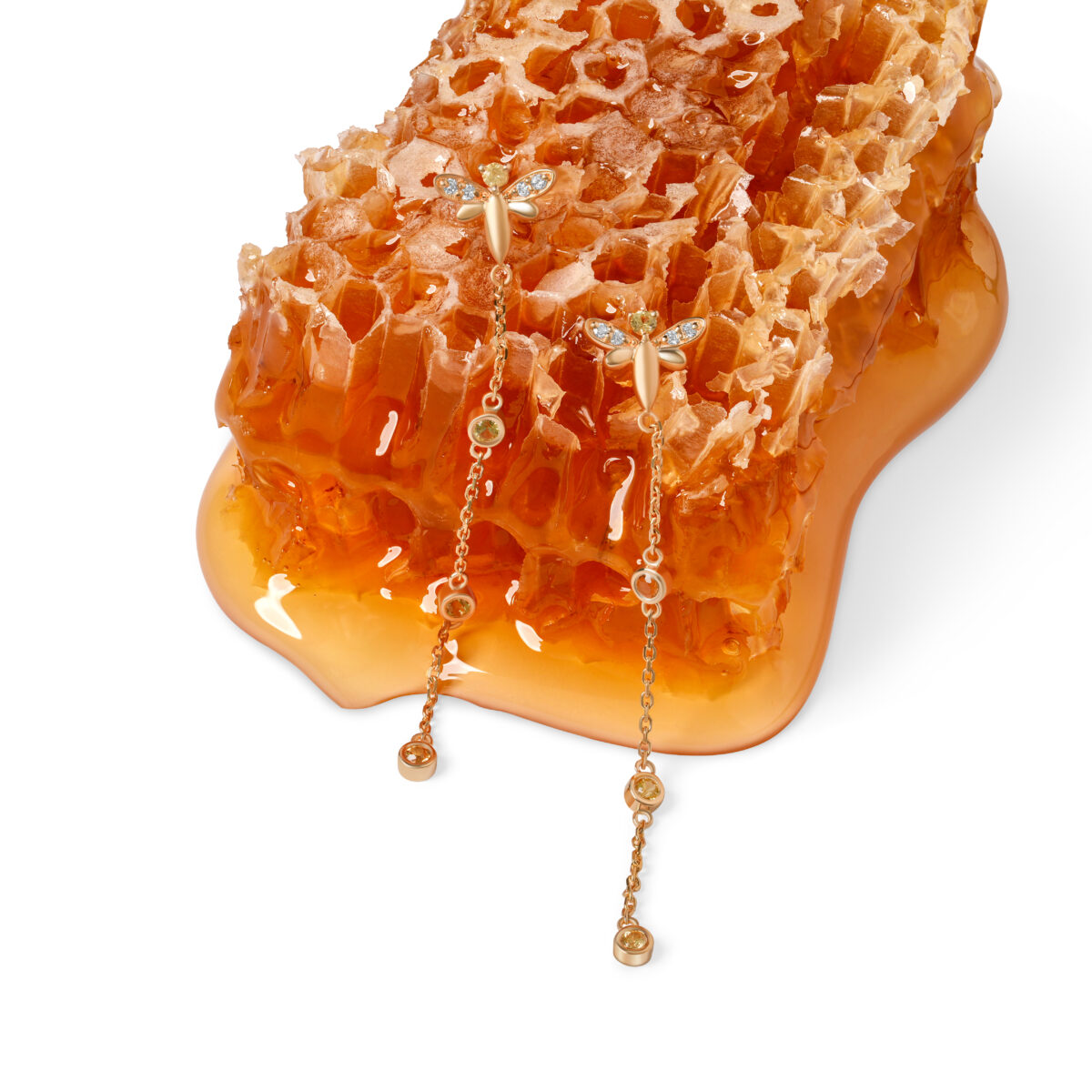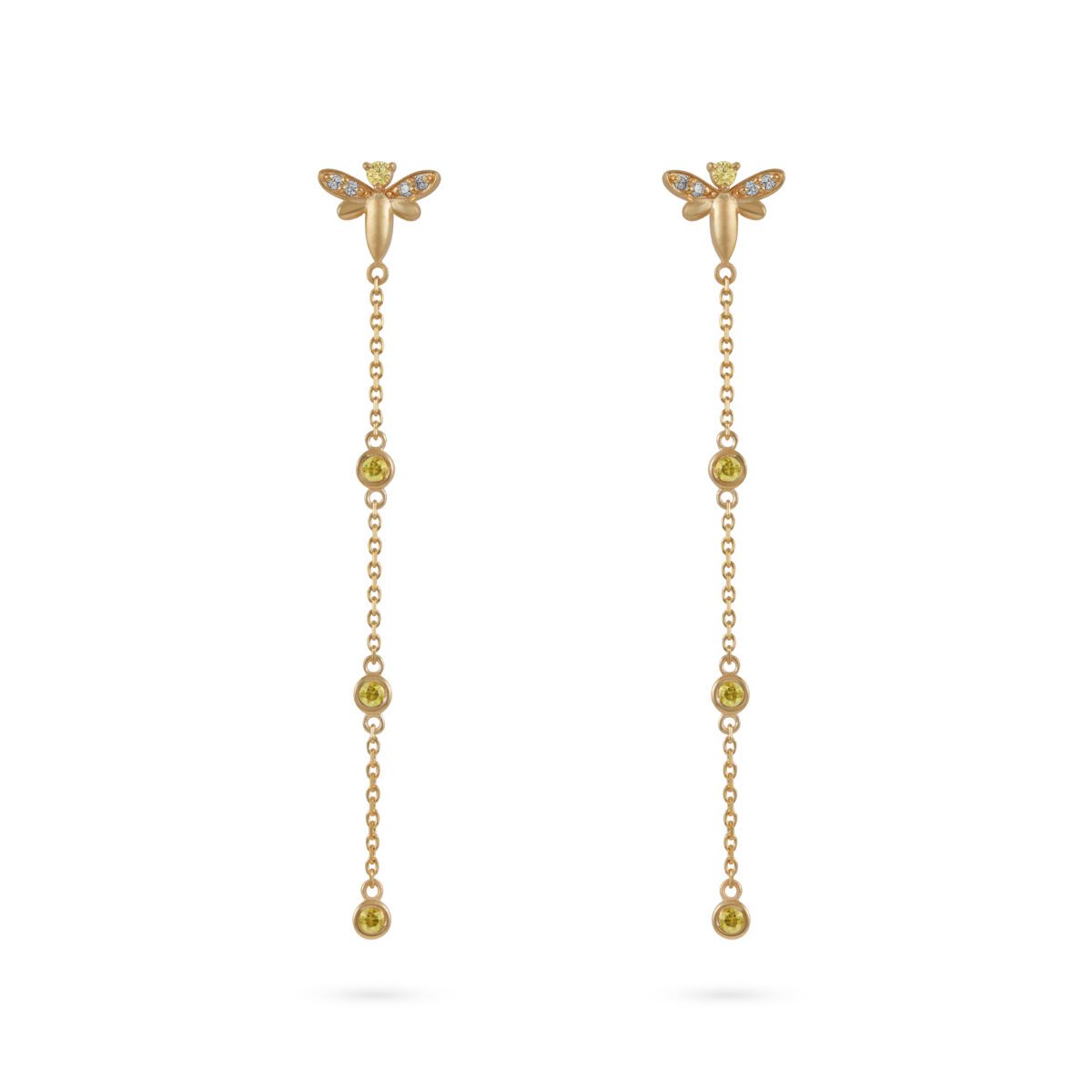 Crafted in 18k yellow gold, these Long earrings feature a delicate bee design accented with 18k diamonds and yellow sapphires for a warm, honey-like effect.