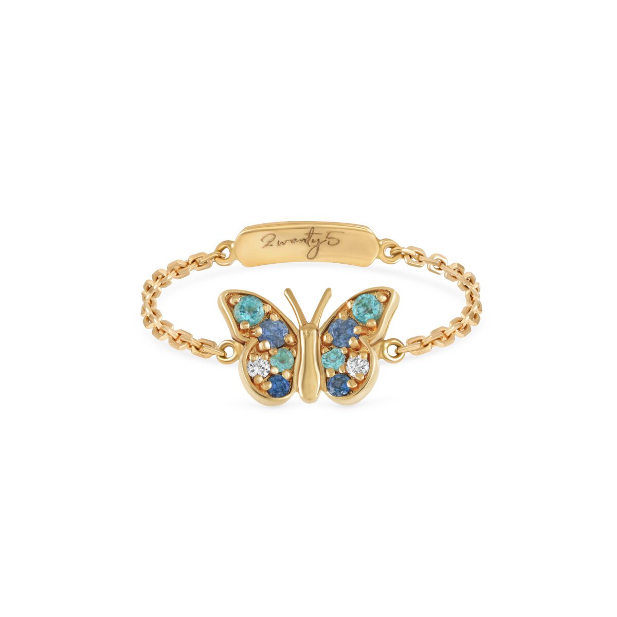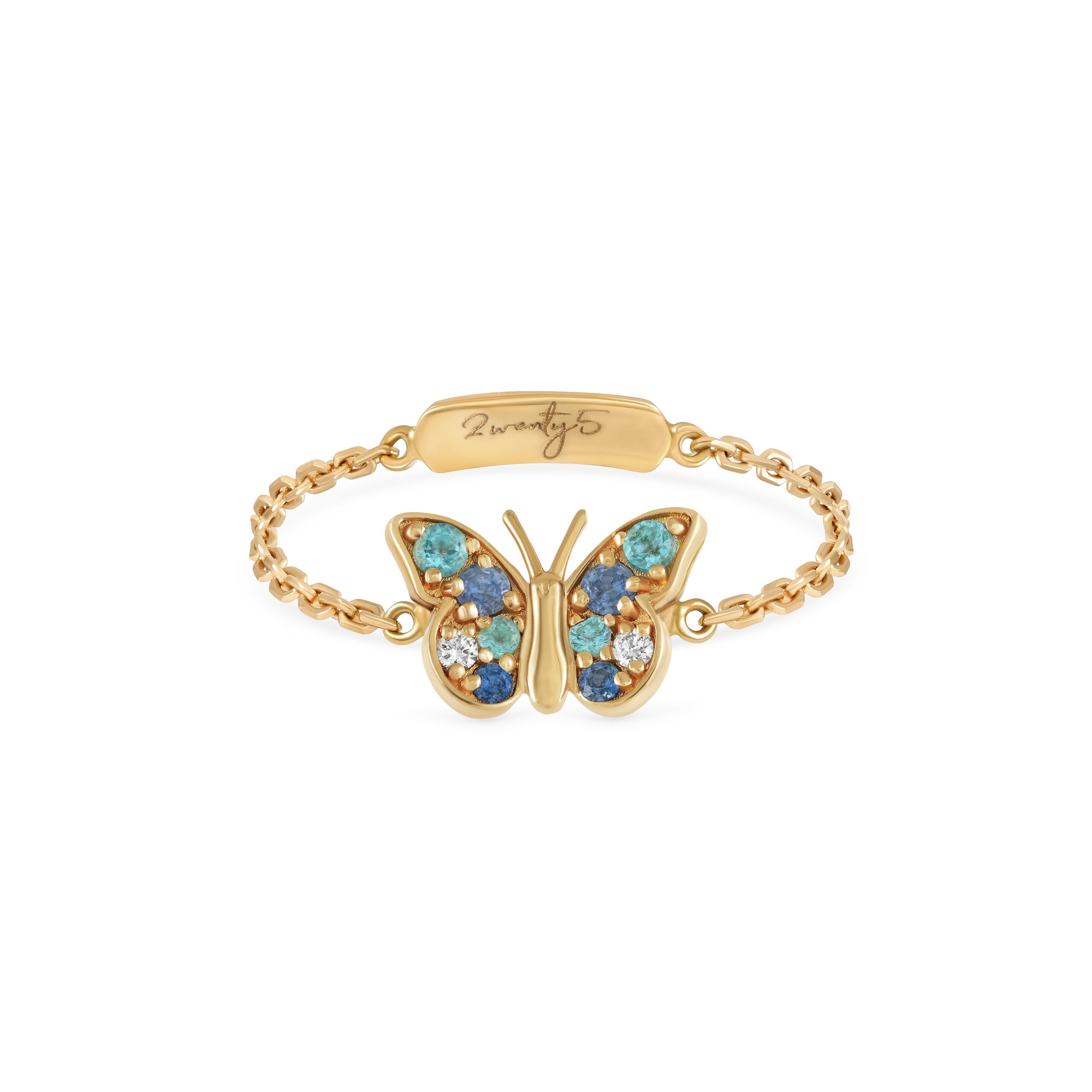 Crafted in 18k yellow gold, this chain ring features a delicate butterfly design set with Aquamarine, Blue Sapphire, and diamonds. A comfortable and elegant piece, perfect for everyday wear.