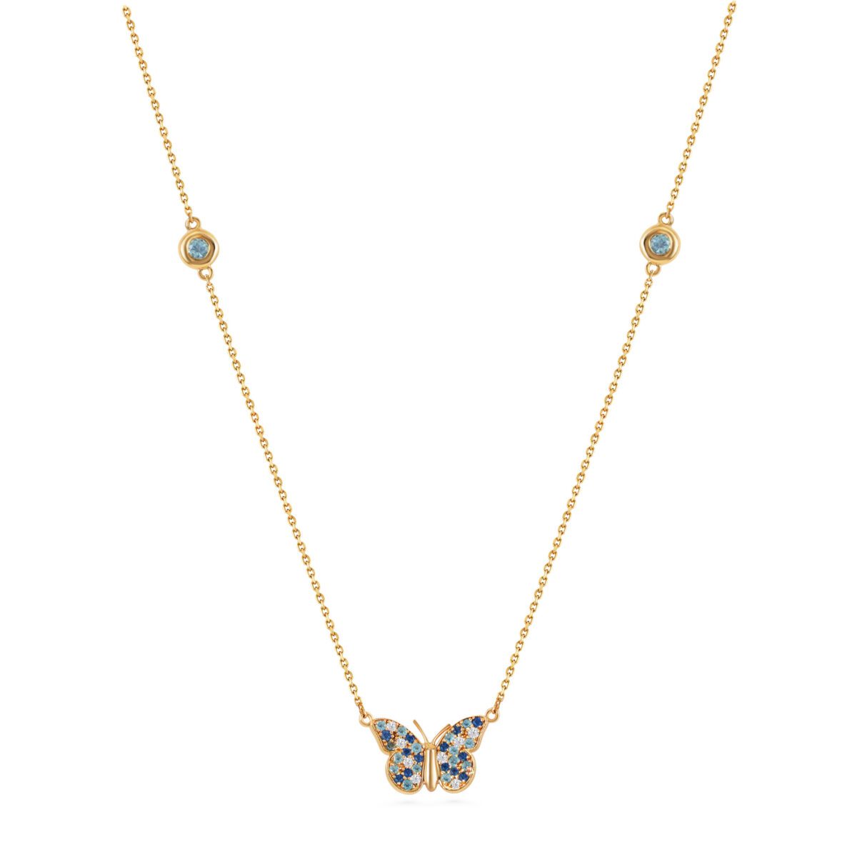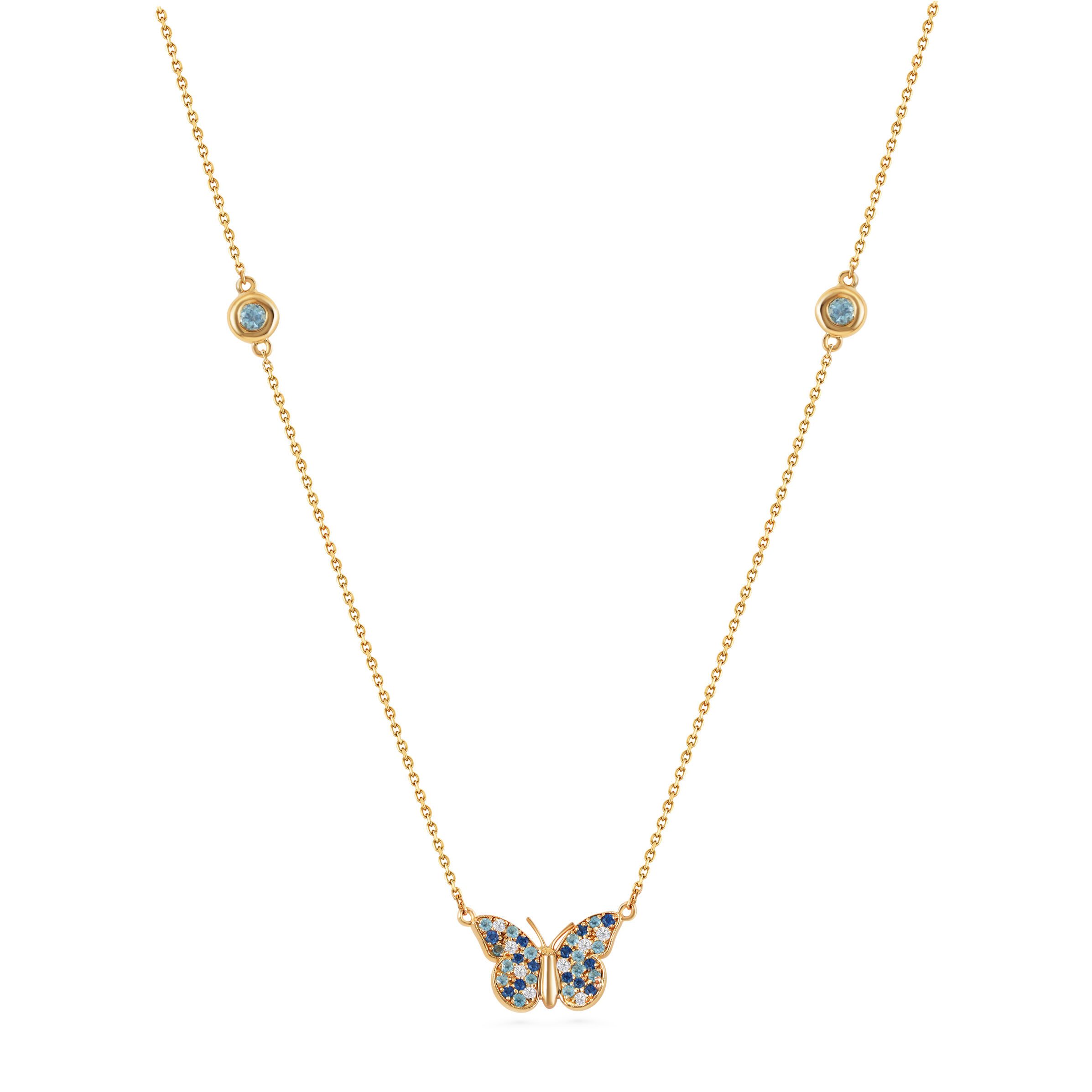 Crafted in 18k yellow gold, this necklace features a delicate butterfly design adorned with Aquamarine, Blue Sapphire, and diamonds. The chain is enhanced with a touch of blue aquamarine, adding a subtle pop of color and elegance to this timeless piece.
