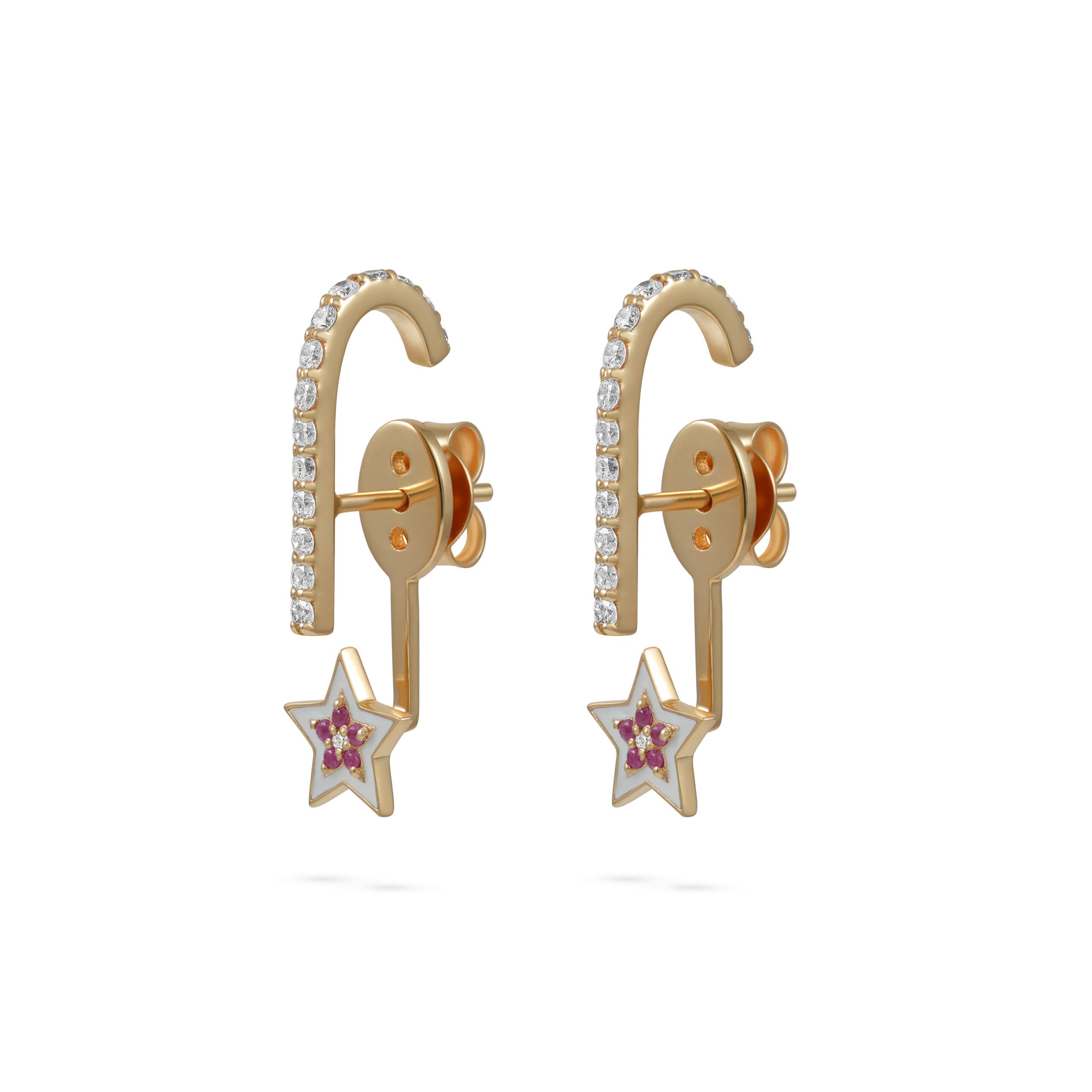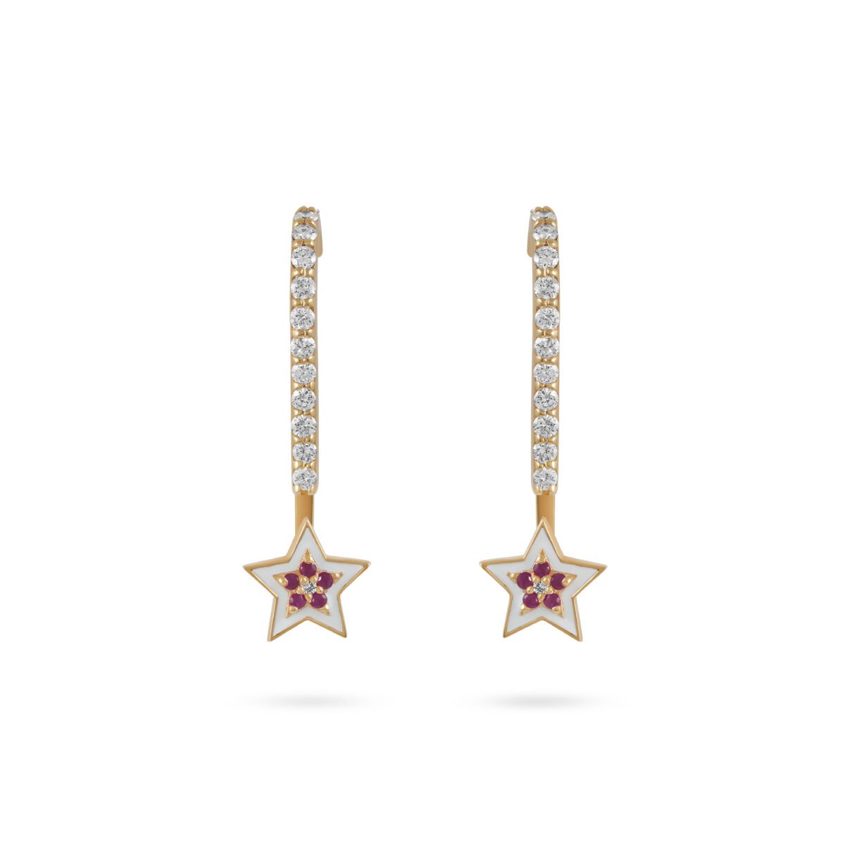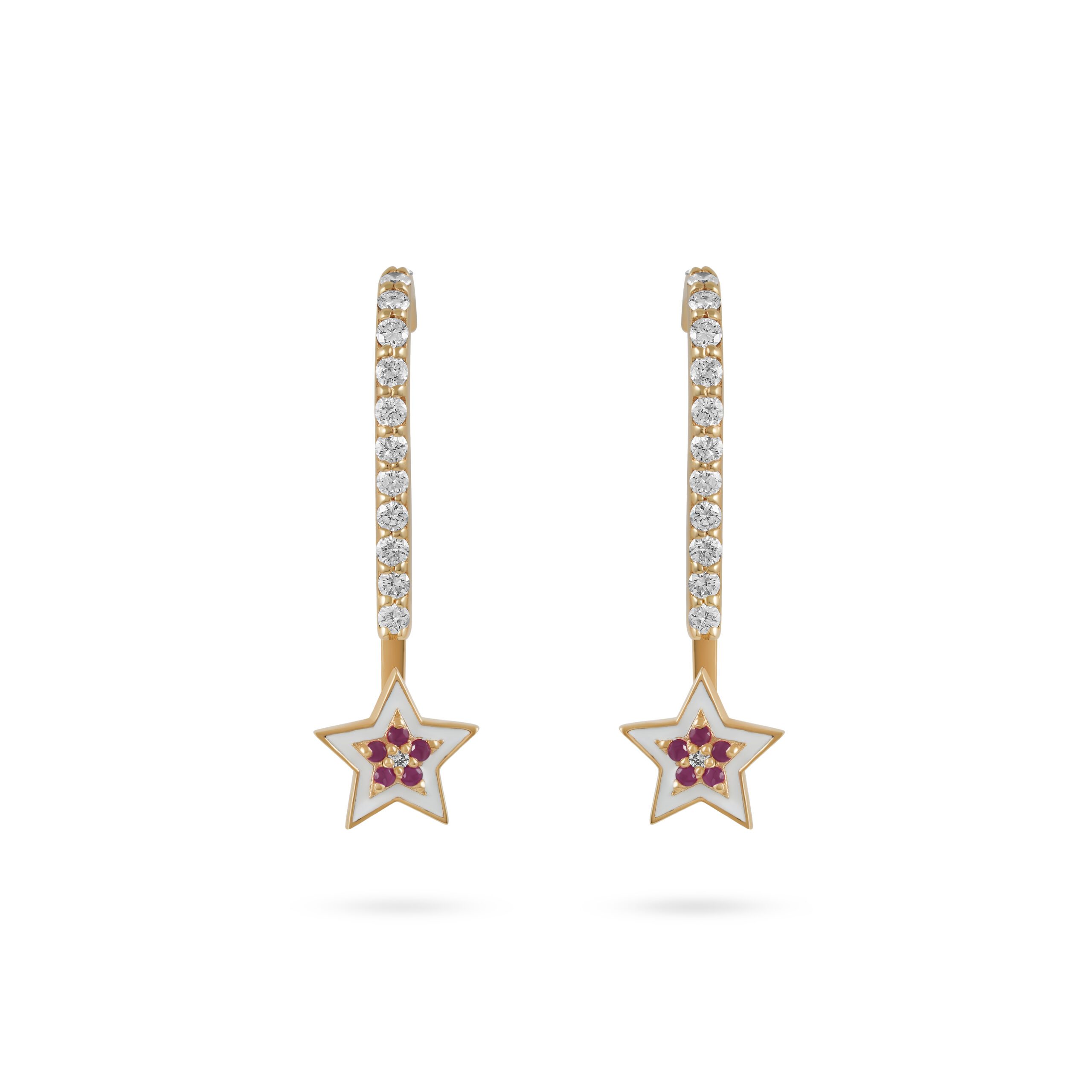 Made with 18k yellow gold, these earrings feature a star design outlined in white enamel, set with 18k diamonds, red rubies, and pink sapphires.